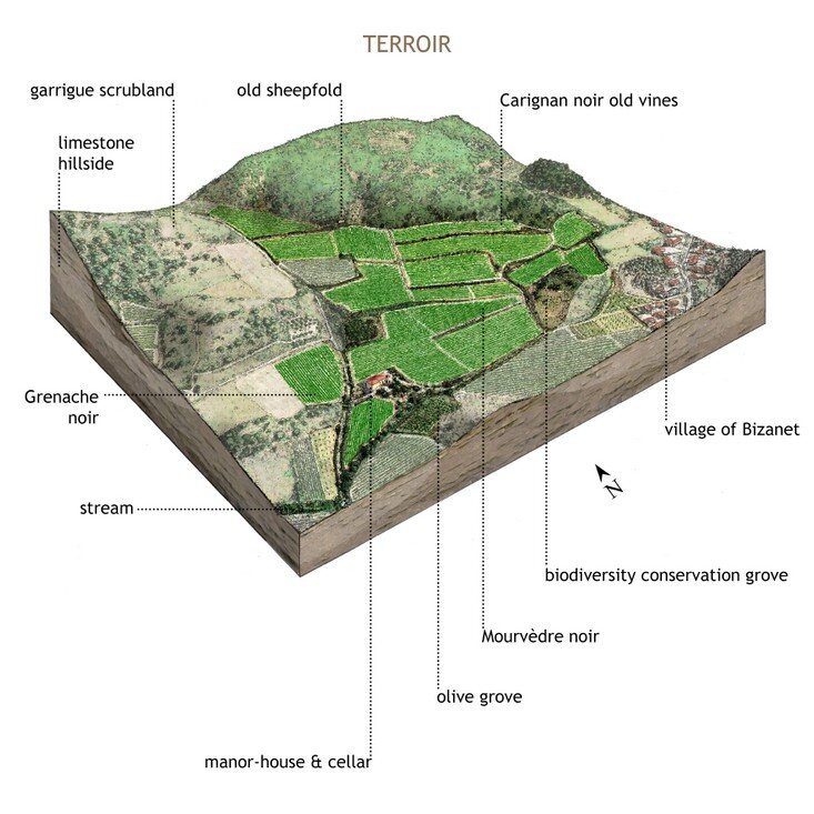 Aumèdes, which takes its name from the Occitan "aumets" or "aumedas”, meaning “elms”, is the oldest estate of the family. The Gallo-Roman remains discovered there attest of a farming activity going back for least two thousand years. The vineyard, planted on a south-facing hillside, covers 40 hectares of terraced plots between the garrigue scrubland and the village of Bizanet. On the hillside, springs gush from the fossiliferous black marls that formed the bottom of the sea during the Jurassic period, more than 170 million years ago. The carignan vines, deeply rooted in the limestone-clay soil, give round and powerful wines. The château, built on the rock, shelters a barrel cellar where the cuvée Emilien Raïssac is aged, a top-of-the-range wine made from the oldest vines of the estate.